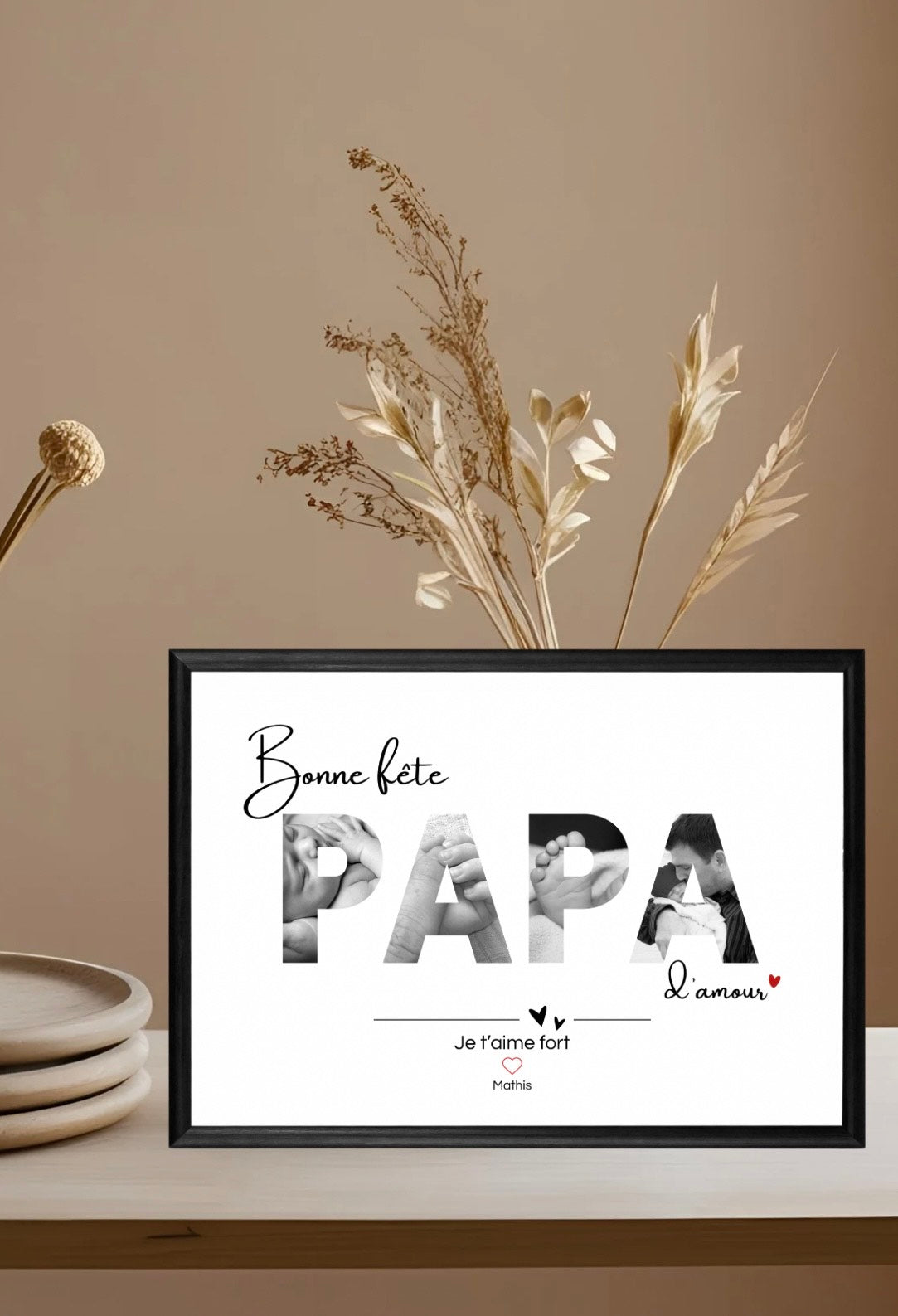 Ce cadre au format A4 a été entièrement personnalisé avec soin, dans mon atelier, pour célébrer l’amour et la complicité entre un papa et ses enfants.